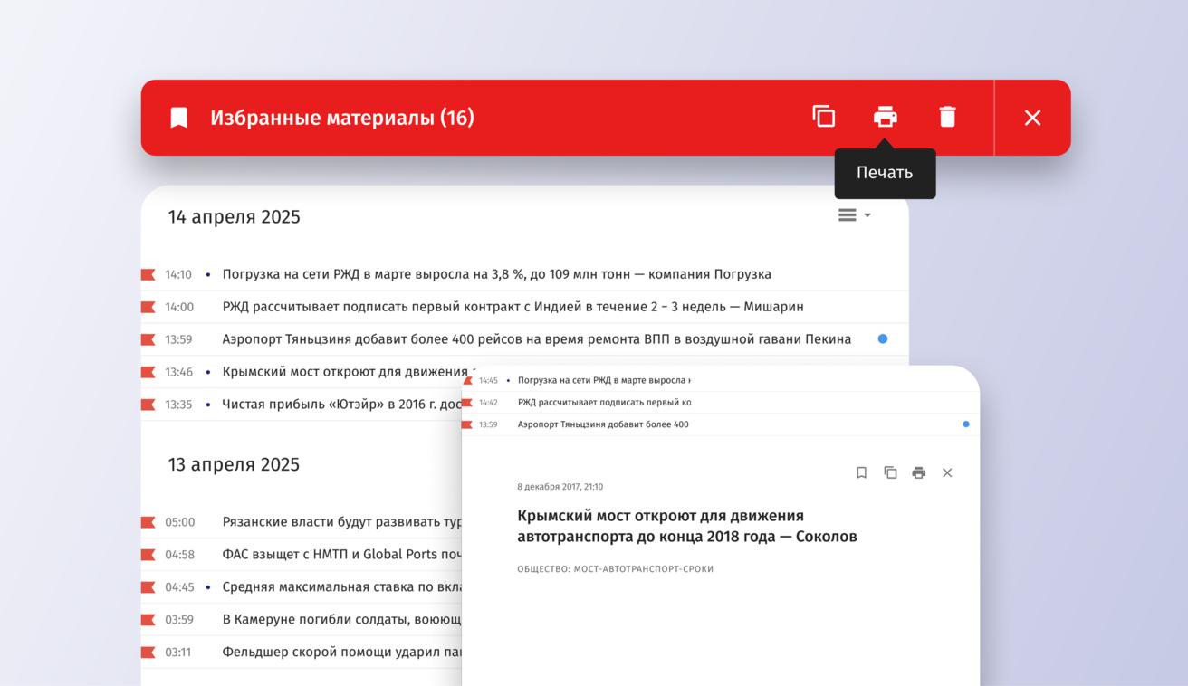 Подбор и группировка материалов в «Избранное», откуда новости можно легко скопировать в буфер обмена, сохранить как pdf и отправить на печать.